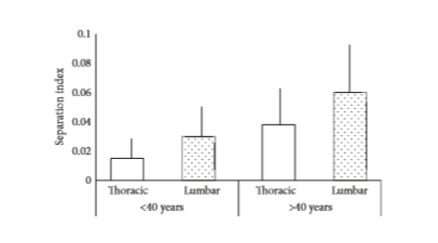 Comparison of the separation index (SI) in the ≤40 years and ≥40 year’s groups. Thoracic and lumbar segments were compared. Errors bars indicate the standard deviation.