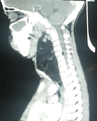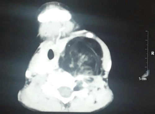 A six year male, child, resident of Saharanpur, Uttar Pradesh, presented to our out-patient department with complaint of gradual onset, painless, progressive single, swelling neck for three years. The child had no history of breathlessness but occasional difficulty in swallowing was present. There was no history of sudden increase in size, voice change or fever. There was no history of similar swelling in other three siblings. There was no history of previous medication or surgery for same.