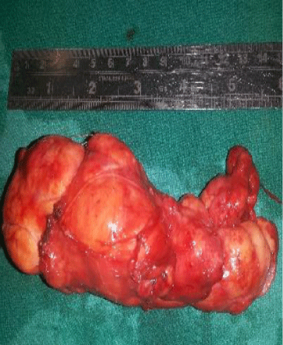Pathological examination of the excised specimen revealed grey white encapsulated soft tissue mass measuring 12x7x5cms, grossly nodular, with cut section revealing grey white to grey- yellow firm areas with no evidence of haemorrhage or necrosis (Figure 5). The microscopic examination showed benign well circumscribed encapsulated mesenchymal tumor comprising of mature adipose tissue separated by fibrous septae, with areas of myxoid change consisting of stellate shaped cells (Figure 6). Myxoid areas stained strongly with alcian blue (pH 2.5). No cellular atypia, mitotic figures, hemorrhage or areas of necrosis were seen.