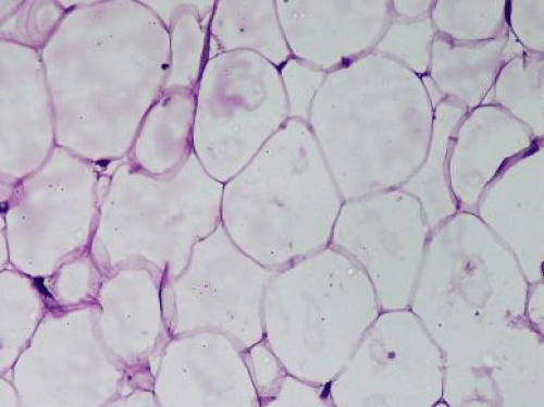 There are varieties of histological variants of lipoma, like angiolipoma, fibrolipoma, spindle cell lipoma, osteolipoma, myelolipoma, chondrolipoma, myolipoma and myxolipoma. Myxolipoma is a lipoma admixed with abundant mucoid substance [7]. This mucoid substance stains positively with alcian blue and gets digested by hyaluronidase. This characteristic differentiates this from mucoid substance seen in Chondrolipoma. The presence of atypical lipoblasts (absence of vacuoles, irregular shaped nuclei and increased cell size) and rich capillary network seen in myxoid liposarcoma, differentiates it from myxolipoma on histopathology.