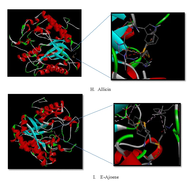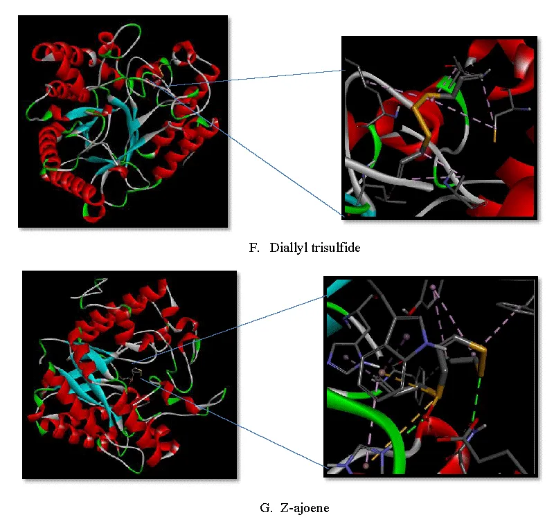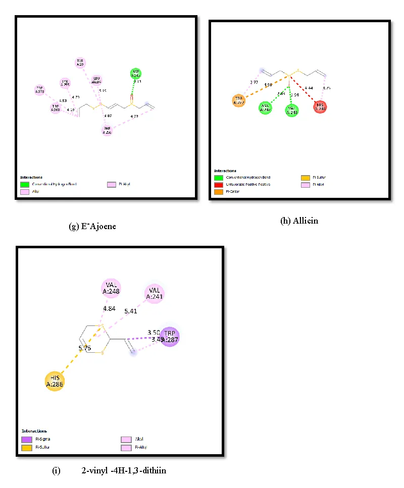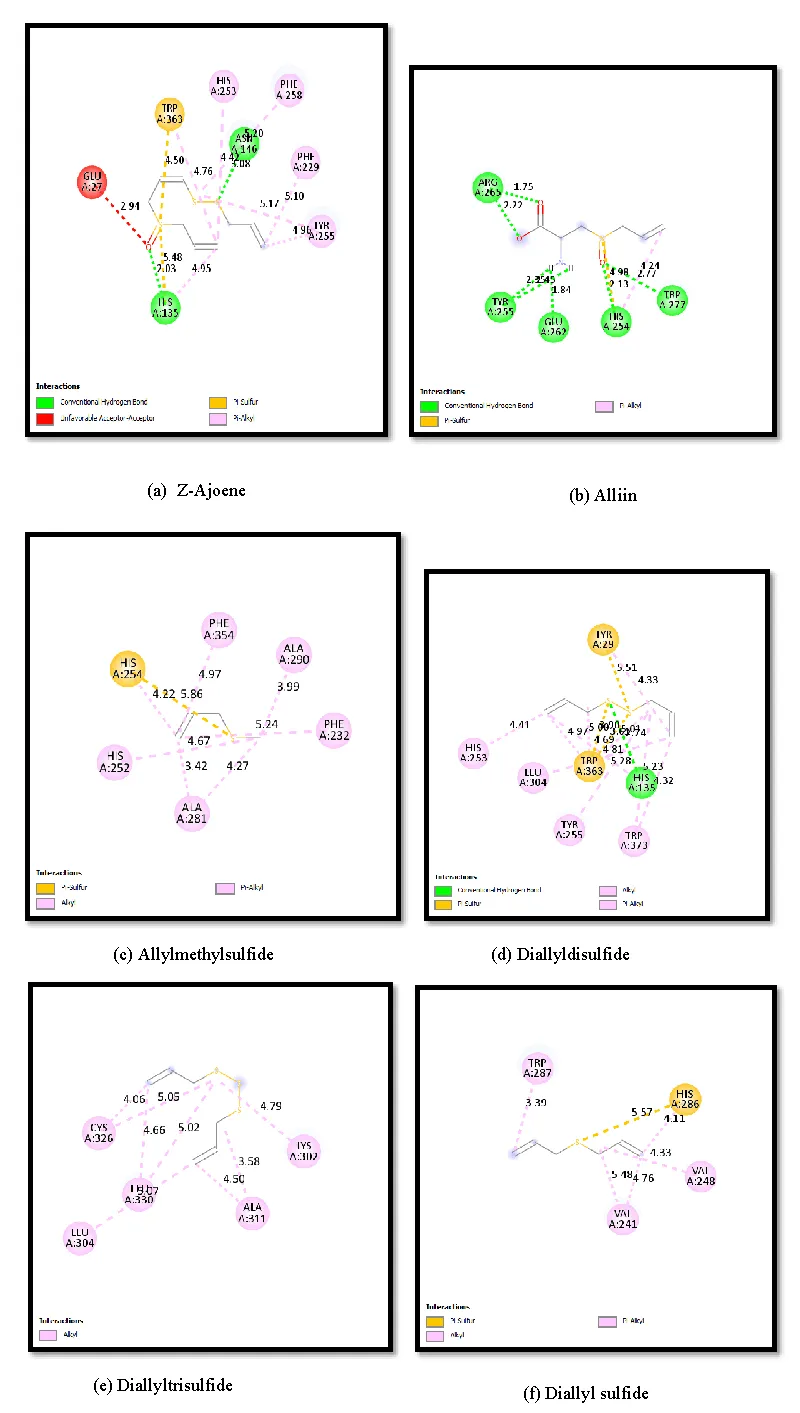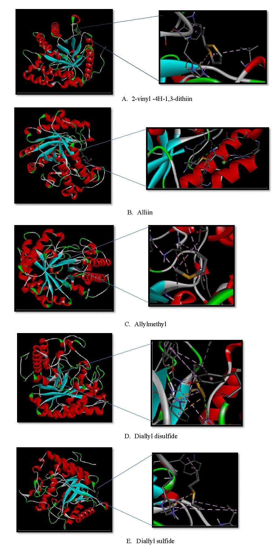 During blind docking of all nine phytochemicals, it was observed that 5 phytochemicals out of 9 were found to form conventional hydrogen bonds, and out of 5, it was observed that only alliin formed the highest number of hydrogen bonds. However, the binding energy and inhibition constant of all nine phytochemicals were determined, as shown in Table 1. Interestingly, Z-ajoene showed the lowest binding energy of -5.07 kcal/mol and inhibition constant of 192.57µM. However, the binding energy shown in table is due to mainly because of the chemical interactions which were depicted in Figure 2. Basically because of the chemical interaction bonds like covalent bond, alkyl bonds, pi bonds, Hydrogen bonds were formed which justify the protein-ligand binding stability.