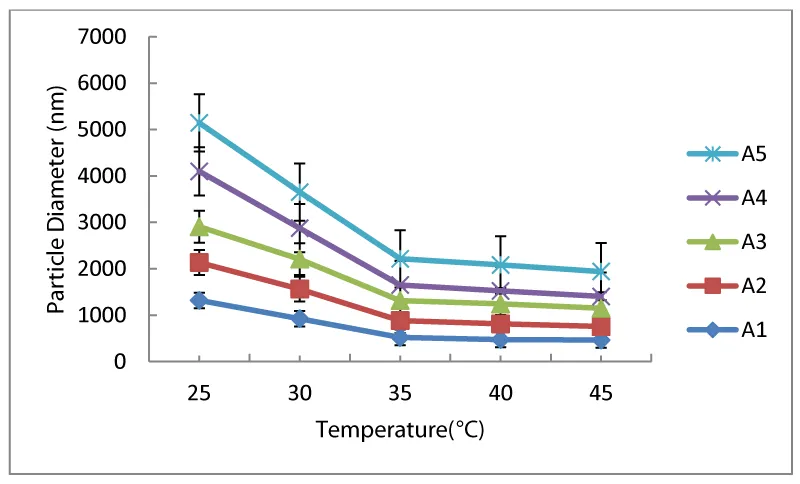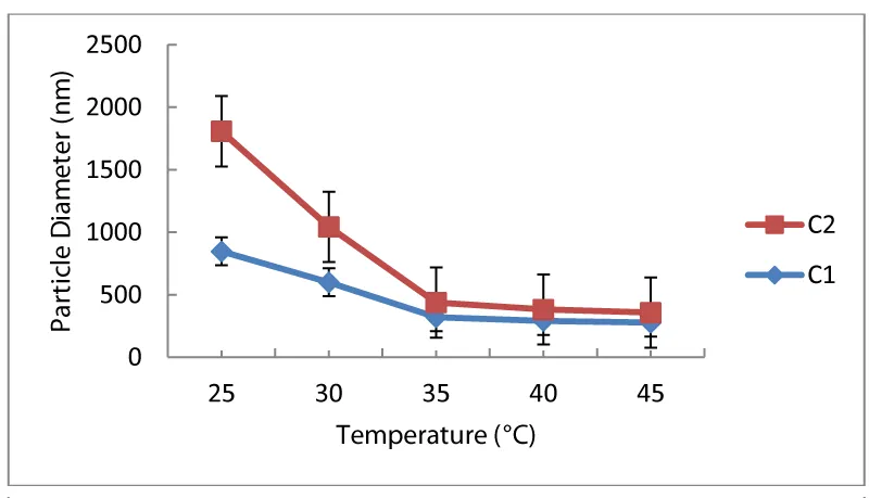 PEG-EEM containing temperature sensitive NIPA nanoparticles in different size range were successfully synthesized by an emulsifier-free emulsion polymerization. PEG-EEM has both hydrophilic PEG and hydrophobic EEM parts in their structure. Therefore, it can behave like surfactant in the aqueous medium. In the first set of experiments, effect of PEG-EEM content on particle size and temperature sensitivity of the particles was examined. For this purpose, PEG-EEM content was changed from 0-0.4 ml in the recipes. At room temperature, particle size decreased from 1300 nm to 800 nm with increased amount of PEG-EEM (0-0.2 ml), however when the content of PEG-EEM reached to 0.2 ml and higher values (0.2-0.4 ml), particle size started to increase as in figure 1. Increase in particle size with decreasing amount of PEG-EEM is reported in literature [12]. As seen in figure 1, all polymeric nanoparticles showed almost the same lower critical solution temperature (LCST), increasing amount of PEG-EEM in the medium does not affect the LCST behavior of the nanoparticles. LCST values of the polymers were around 35°C. Although, at temperatures before LCST, particle size considerably changed with increased amount of PEG-EEM when particles are in their relaxed form, after LCST, particles contracted to their final size and did not change much with increased amount of PEG-EEM in the medium.