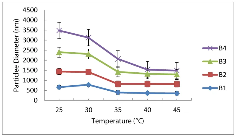 MBA in the recipe was used as crosslinking agent and amount of it was changed from 0.02 to 0.16 g. Particle size increased with the increased MBA content in the recipes (from 650 nm to 1100 nm) as seen in figure 2. Initially, crosslinker amount did not affect the LCST behavior of the polymer as seen in figure 2, however, after addition of 0.16 g, LCST sharply changed from 35°C to 40°C. Sample B4 contracted more with temperature increase compared to the other samples and became 100 nm in size. Increased amount of crosslinker in the medium prevented movement of chains in the free volume as expected.