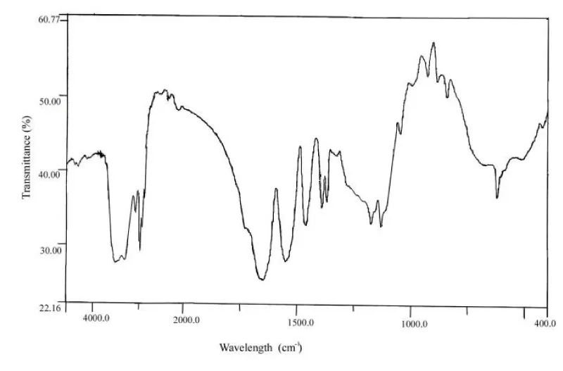 Chemical structure of the particles determined from FTIR spectrum (Figure 4). FTIR spectra of the copolymer synthesized are (KBr Pellet), cm-1: 3500-3400 (w) primary amine (NH stretching), 3078 =CH2, 2976-2878 -CH3 and –CH2, 1725 C=O stretching, 1650 (s) N-H in-plane bending, 1552 (s) N-H stretching, 1460 CH stretching, 1388-1367 CH stretching, 1172, 1130-1049 (w) C-O-C stretch bands, 927-841 (m-w) C-C stretching of main chain, 617 C=O out of plane bends.