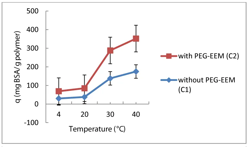 Both addition of PEG-EEM and temperature effect on adsorption capacity of particles examined. In this part of the study, conditions for BSA adsorption kept constant for poly (NIPA/PEG-EEM) as the conditions applied for NIPA alone. Temperature effect on BSA adsorption capacity of NIPA/PEG-EEM based latexes (sample C2) examined in figure 5. Adsorption capacity of both NIPA and NIPA/PEG-EEM latexes increased in similar manner with increase in temperature. However, amount of BSA adsorption on NIPA/PEG-EEM particles was slightly higher than the NIPA alone due to increase in hydrophobicity with addition of PEG-EEM.