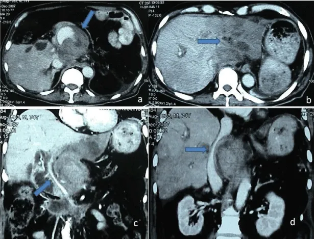 On the 30th day of the pancreatectomy he was readmitted to emergency department with fever complaint again. But his vital signs showed he was in shock, may be caused by sepsis. Computed tomography was performed urgently and gastroduodenal artery pseudoanevrism rupture and intraabdominal bleeding diagnosed. He had retroperitoneal hematoma that was compressing to vena cava inferior and portal vein. And the left hepatic lobe was ischemic (Figure 1). He was operated urgently, during the laparotomy he had mild bleeding in the abdominal cavity but he had ruptured gastroduodenal artery aneurism, app.10cm was seen. Arterial aneurismatic ruptured side was under compression by the hematoma without active massive bleeding. Gastroduodenal artery dissected and the trunk from the hepatic artery exposed and ligated. Hepatic artery doppler ultrasound confirmed the flow at the right side but there is no arterial flow at the left side. Portal vein left and right branches seen avoided but the left lobe of the liver was seen blue. Hemostasis after aneurismectomy provided. There is no fluid collection, abscess or any other surgical complication seen inside the abdomen. Patient taken to the theater under hemorrhagic shock with wicked general condition and due to damage control surgery procedure left liver left in this situation. In the 3rd day of the surgery he was taken to ward from ICU and liver ischemia was well-treated by conservative approach. The patient stayed alive without local or systemic recurrence of disease on the 14 months follow-up after the initial treatment.