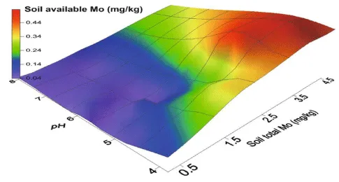 Mo generally exists in highly soluble form, and is rare in the soils building it liable to leaching. Though, usually consider that in the acidic soils the molybdenum is attached to mineral surface, it may avoid the leaching, but it may also obstruct uptake by microbes. Usually contents of Mo between 0.6 and 3.5 ppm exist in the most of the agricultural soils with about 2.0 ppm an average Mo and 0.2 ppm, average available molybdenum. As an oxycomplex (MoO42-), Mo largely occurs in the soil. Because of this, in its behavior in the soil, Mo more resembles to the phosphate or sulfate. By soil minerals and colloids molybdate is adsorbed in related way to these two anions. This adsorption is very closely dependent on the soil pH [29]. It increases as the pH falls but at the neutrality it is very low. On acid soil availability of Mo for the plants is the poorest and can be upgraded by foliar application, seed priming, seed coating pelleting and with liming, in case soil is not characteristically lacking in molybdenum [18].