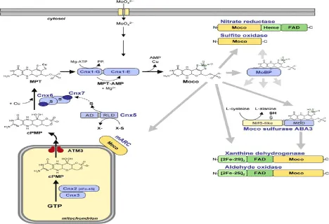 Generally, the transmission of an oxygen atom to is catalyzed by all the Mo-enzyme or to from a substrate (Hille, 2002). Each reaction, by transfer of two electrons either oxidation or reduction, is also characterized by this, which imposes to fluctuate between IV and VI, its oxidation state of Mo atom. Mo-enzymes are the homodimeric proteins that are present in eukaryotes which are functioning solitary as a dimer, but not as monomer. On the monomer of enzyme isolated domain are identified that are bound to it, different prosthetic groups are involved by some harbor an electron transport chain. Figure 4, point out the five Mo-enzymes of plants domain structure where by the regions that are very much capricious in the order, the domains are linked as a result clearly serving as inter-domain joint regions. It is evident that Mo-enzymes into two classes can be subdivided: XO oxidase family is symbolized by AO, and XDH while Mo-enzyme’s SO-class is formed by the NR and SO both classes sharing the domains. From GTP to cPMP the conversion starting, in mitochondria basic steps of Moco biosynthesis are shown, entirely in cytosol succeeding steps continue. Moco-binding proteins (MoBP) and Moco biosynthesis enzymes (named Cnx) have been represented in blue. By Cnx5, consisting of Cnx6 and Cnx7 MPT-synthase is sulfurated, with sulfur donor that is primary (X-S) militarized by Cnx5 (RLD) rhodanese-like domain being unidentified. For adenylation and activation of the small MPT synthase subunit Cnx7, the adenylation domain of the Cnx5 (AD) is required. It is supposed that after dithiolene formation, copper (Cu) is inserted directly. Moco can be either bound to these Mo-enzymes NR, SO, XDH, mARC and AO, to a MoBP (Moco-binding protein), or to the MBD (Moco-binding C-terminal domain) of Mocosulfurase ABA3. ABA3 C-terminus is sulfuration platform for Moco. ABA3 domain like NifS makes the persulfide protein-bound, which bound to its C-terminus is transferred to the Moco that for the sulfurated, Moco exchanges the non-sulfurated. In the figure, Mo-enzyme monomers domain structure is given. It is obvious that Mo-enzymes of eukaryotes are interrelated to each other: A pair is formed by the AO and XDH, from ABA3-MBD, mARC arose and forms NR a pair with SO Figure 5 [16].