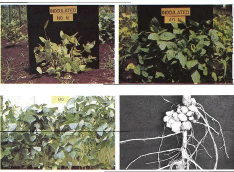 Soybean growing without Mo fertilizer on a Mo-deficient soil in the upper left. Soybeans were a normal green color, indicating adequate N. Soybean without Mo but with N fertilizer as shown in the upper right. Soybean growing without N in the lower-left fig. and with Mo caused in superior growth and effectively nodulated soybean plants while nodulated soybean roots from plants growing on Mofertilized soil in the lower right [74].
