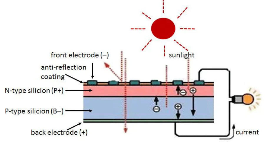 The principle of PV-system is that by adding energy, electrons are activated in a semiconductor. Namely, with the addition of sunlight energy, the electrons of the PV-system are activated and pass from a lower energy state to a higher energy state. This leads to the generation of electricity, in a semiconducto [14] (Figure 3).