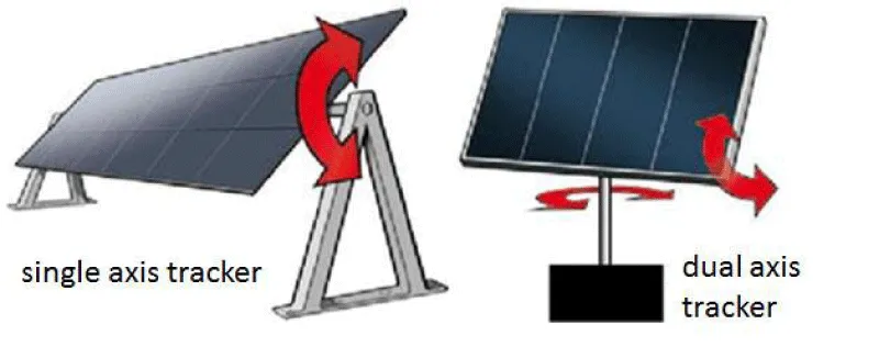 PV-panels may be inefficient in collecting all available solar energy due to the fluctuating solar flux. In order to increase the amount of collected available solar energy, the so-called “concept of solar tracking” is applied [18]. Single-axis and dual-axis solar tracking systems can be applied in the “solar tracking concept” (Figure 6). The tracker is a device that increases the collected solar energy by, in daylight, keeping the thermal photovoltaic modules in the optimal position - perpendicular to the solar radiation [19]. The concentration of available solar radiation is associated with solar trackers and PV modules according to the movement of solar energy to get substantial solar energy than fixed photovoltaic modules.