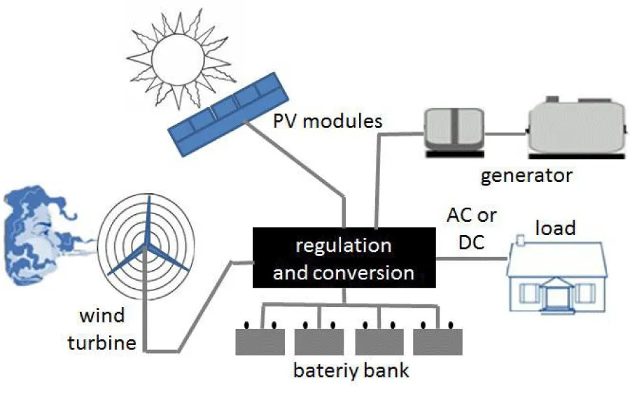 Hybrid power systems can be used in cases where photovoltaic modules have difficulty generating constant power for consumption [20]. This system combines a one renewable energy source (e.g. PV- system) with other forms of renewable energy generation (e.g. wind), even with form of a conventional generator running on diesel (Figure 7). In this case, the use of hybrid systems reduces the consumption of non-renewable fuels [15]. Hybrid systems can be positively integrated to make the power system consistent without disrupting the daily activities of the domestic sectors.