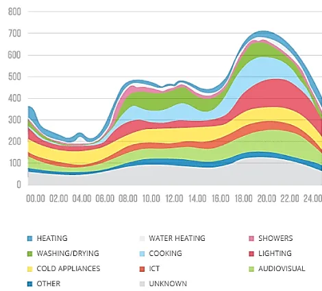 This wind farm is capable to provide energy for approximately 40,000 households in the surrounding area. It has been assumed that the load profile of each household is the one that can be seen in the figure. The y-axis corresponds to Power (W) and the x-axis to hours during a typical day. Each day it is estimated that there is 9.55 MW available for storage in the selected ESS for approximately 12 hours (Figure 3).