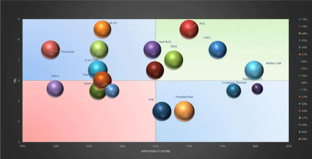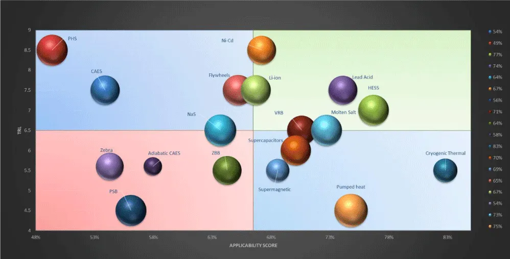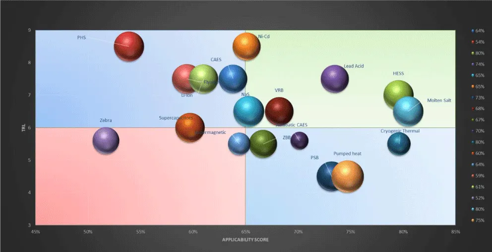 In this study, an assessment methodology of the available ESS will be employed to create the final bubble plot. This plot will facilitate the selection of the most appropriate storage technology for each scenario. The assessment methodology that this study is based on includes the techniques of Technology Readiness Levels, the Applicability Indicators under various constraints and lastly the determination of the uncertainty that is related to both previous techniques.
