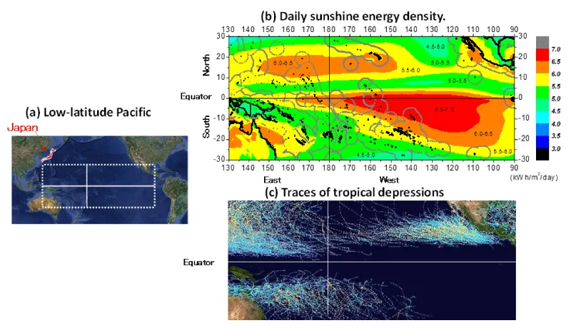 As the greatest risk to this energy system, tropical depressions named typhoons, hurricanes, or cyclones can never be ignored. Nevertheless, two wide areas of low-latitude Pacific are free from the risk as indicated in Figure 2(c) [8]. One is overlapping with the highest sunshine density area mentioned above due to exceptionally low-temperature seawater originating from Antarctica. Another is within ≈± 5° along the equator where the tropical depressions cannot theoretically be born because the Coriolis Effect is not working there. In other areas, the risk tends to increase but is not as severe as in the middle latitude. Ever-advancing ocean meteorology will surely facilitate reliable predictions of tropical depressions in a few weeks ahead for early evacuations. As for one more natural disaster, a tsunami, the effect may not be critical to this energy system as long as it stays remote from shallow coastal areas.