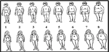 The questionnaire of body image perception includes 8 shapes that represent the general view of the body shape [32]. Its spectrum ranges from 1 to 8 (extremely thin to obese). The participants select among eight shapes the one that best corresponds to the current size of their body (CBS). This selected shape shows the contour they believe they are. Additionally, they select a shape that best corresponds to their Ideal Body Size (IBS). The degree of dissatisfaction with the body size (DDBS) is yielded through the formula of CBS minus IBS. The DDBS score indicates the degree of dissatisfaction of the body shape, therefore a positive score means that the individual wants to lose weight, and the negative score indicates their tendency for gaining weight.