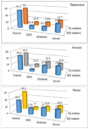 Furthermore, Table 1 shows that there is no significant difference between the basic medicals and physiopathology students in terms of prevalence of depression and anxiety symptoms (p<0.05), although the difference of stress symptoms was significant between two groups (p=0.019) (Table 1).