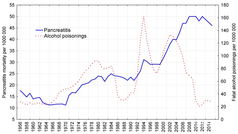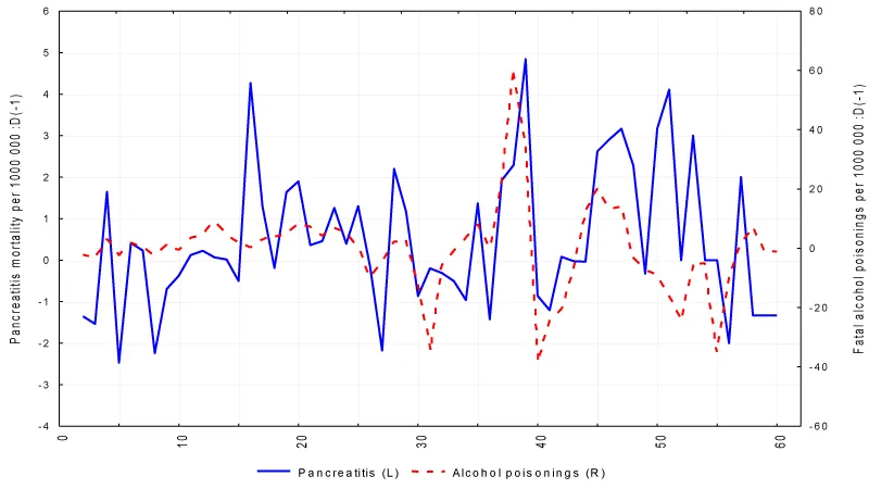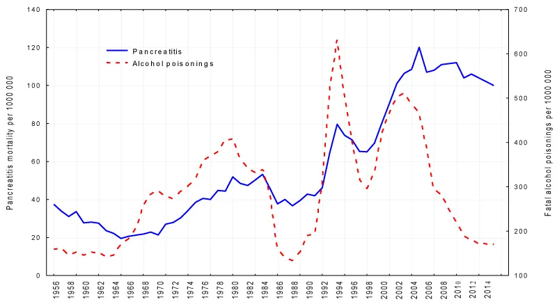 Before concluding, several potential limitations of this study must be mentioned. In particular, a close relationship between fatal alcohol poisonings and pancreatitis mortality does not rule out the possibility that other factors have also influenced the development pancreatitis mortality rate. Although alcohol is regarded as the most important risk factor for pancreatitis, a number of other causal factors that influence the risk of development of pancreatitis have been identified, including diet and smoking [10]. The presence of these causal factors is likely to have distorted the estimated alcohol effects. It seems that the role of non-alcohol causes in pancreatitis mortality increased during the last decade.