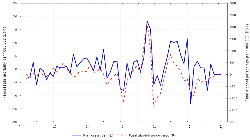 The statistical analysis was performed using the package “Statistica”. It is generally agreed that bivariate correlations between the two raw time-series are spurious due to common sources of trends and autocorrelation [26]. Therefore in order to reduce the risk of obtaining a spurious relation between two variables that have common trends, the trends should be removed by means of a differencing procedure: ∇xt = xt - xt-1 This means analyzing annual changes rather than raw data. The process of removing systematic variation within time series prior to the examination of potential causal relationships is referred to as “prewhitening” [27]. A further step entails the inspection of the cross-correlation function in order to estimate the association between the two prewhitened time series. We used an unconstrained polynomial distributed lags analysis to estimate the relationship between the time series fatal alcohol poisoning (independent variable) and pancreatitis mortality (dependent variable) in this paper.