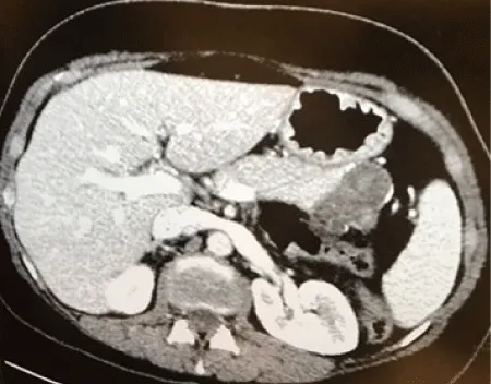 The tumor was non-secretory without any associated symptoms of diarrhea or flushing, therefore no related further investigations were needed. A total body and selective hepatic MRI were performed, showing a mass syndrome at the tail of the pancreas of 4.5 cm, without suspicious hepatic nodule. Only serum cancer antigen (CA 19-9) was elevated at 41 ng/dl. A tentative CT-guided trans-gastric access fine needle aspiration (FNA) of the pancreas revealed no pancreatic tissue. Hence, the patient was diagnosed with indeterminate pseudo cystic neoplasm of the pancreas, and underwent an extended curative R0 distal Splenopancreatectomy. The pathology revealed a completely resected well-differentiated endocrine tumor without lymph node involvement. An immunohistochemistry (IHC) study was positive for CD-56, vimentine, CD-10, as well as for ki-67 antigen with low mitotic index (0-1%), thus, in favor of Grüber-Frantz tumor. Synaptophysin and anti-chromogranin were negative. Post-operative course was uneventful, and the patient was discharged at day 6 post-op. An abdominal MRI was recommended at 6-month follow-up.