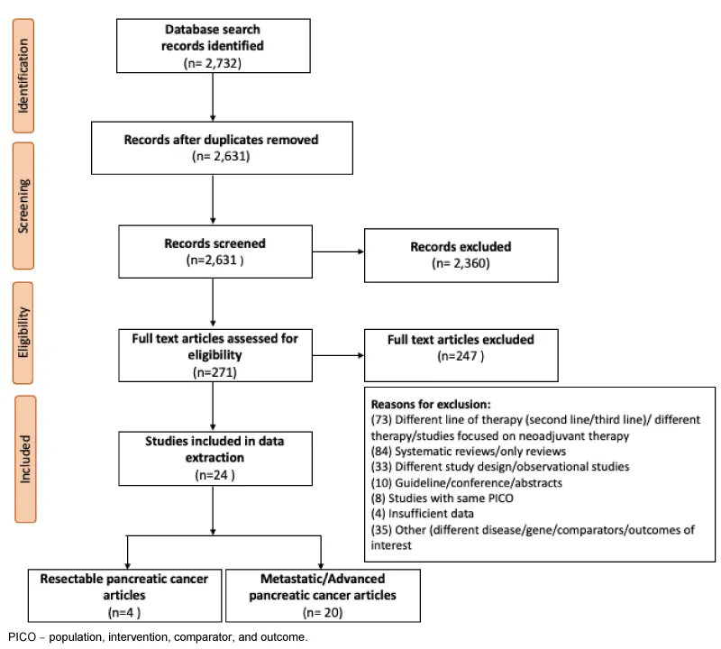 A total of 2,732 publication were screened and of those 271 (9.92%) full-text articles were assessed for eligibility. From 271 articles, 24 (8.85%) [17-40] articles corresponding to 168 meta-analyses in patients with either resected (n = 34) or metastatic (n = 134) PCs were included in this umbrella review (Figure 1). The reasons for exclusion for the remaining 247 (91.15%) articles are provided in supplementary material (eTable 3).