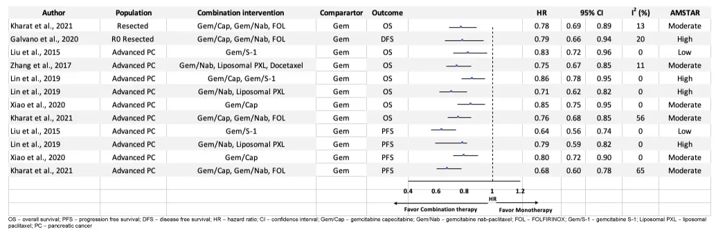Results: A total of 2,732 records were identified with 24 articles corresponding to 168 meta-analyses in resected/metastatic PC. Two (8.3%) studies were found to be of high methodological quality. Eighty (47.6%) meta-analyses reported survival benefits of using combination chemotherapy, while 88 (52.4%) meta-analyses reported safety outcomes. 78 (46.42%; 36-efficacy, 42-safety outcomes) of the 168 meta-analyses were statistically significant (P ≤0.05). No meta-analyses were found to be of high-quality evidence. Twelve meta-analyses reporting the survival benefits of gemcitabine combinations were graded as moderate quality of evidence. Combination regimen FOLFIRINOX, gemcitabine nab-paclitaxel (gem/nab), and gemcitabine capecitabine (gem/cap) compared to gemcitabine monotherapy were found to improve overall survival (OS) and progression free survival (PFS) for both resected (OS: HR = 0.78 (0.69-0.89); PFS: HR=0.79 (0.66-0.94)) and advanced PC (OS: HR = 0.76 (0.68-0.85); PFS: HR = 0.68 (0.60 -0.78)). One meta-analysis comparing the gemcitabine combination regimens (with Nab/Paclitaxel or Capecitabine) versus monotherapy among metastatic PC patients was upgraded to high quality after a sensitivity analysis excluding small-sized studies (PFS; HR = 0.78 (95% CI, 0.69-0.88)). The remaining meta-analyses were either low or very low quality of evidence.