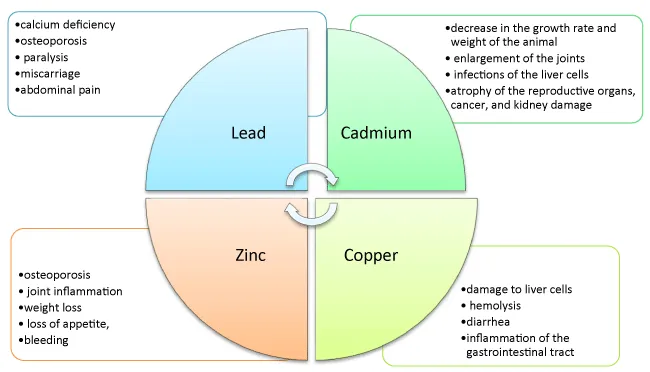 Heavy metals affect animal health, as they enter the animal’s body either when they consume crops that have accumulation of heavy metals through heavy metal-rich soil, or by drinking water contaminated with heavy metals [4]. Among the heavy metals that affect animal health are lead, cadmium, mercury and zinc. These metals primarily affect the brain, liver, kidneys and the reproductive organs. They may cause hormonal imbalance, lack of eggs and sperm, poor growth of the placenta and reduced animal production. Scientific studies have also shown that animals that grazed in places rich in these heavy metals are more prone to infertility compared to those who do not [13]. Cadmium causes a decrease in the growth rate and weight of the animal, enlargement of the joints, infections of the liver cells, atrophy of the reproductive organs, cancer, and kidney damage. While exposure to lead causes calcium deficiency, which results in weak bones and osteoporosis and in some cases it may induce paralysis, high rates of miscarriage and abdominal pain. Copper causes damage to liver cells, degradation of red blood cells, diarrhea, and inflammation of the gastrointestinal tract. Zinc causes osteoporosis, joint inflammation, weight loss, loss of appetite, and bleeding Figure 2 [14].