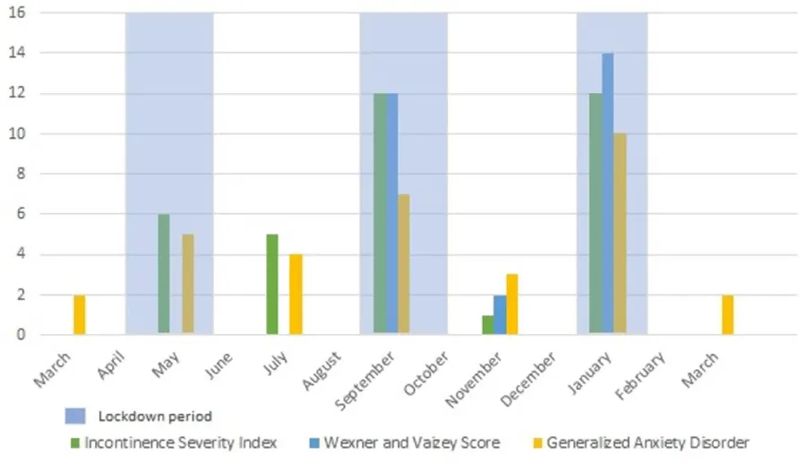 During the second lockdown period, her symptoms worsen and she started suffering from fecal urgency and fecal urge incontinence, scoring then 12/12 on the ICIQ, 12/24 on the Wexner and Vaizey Score and 7/21 on the GAD-7. After the patient continued pelvic floor physiotherapy in the post lockdown period, she improved in all aspects scoring 1/12 on the ICIQ, 2/24 on the Wexner and Vaizey Score and 3/21 on the GAD-7.