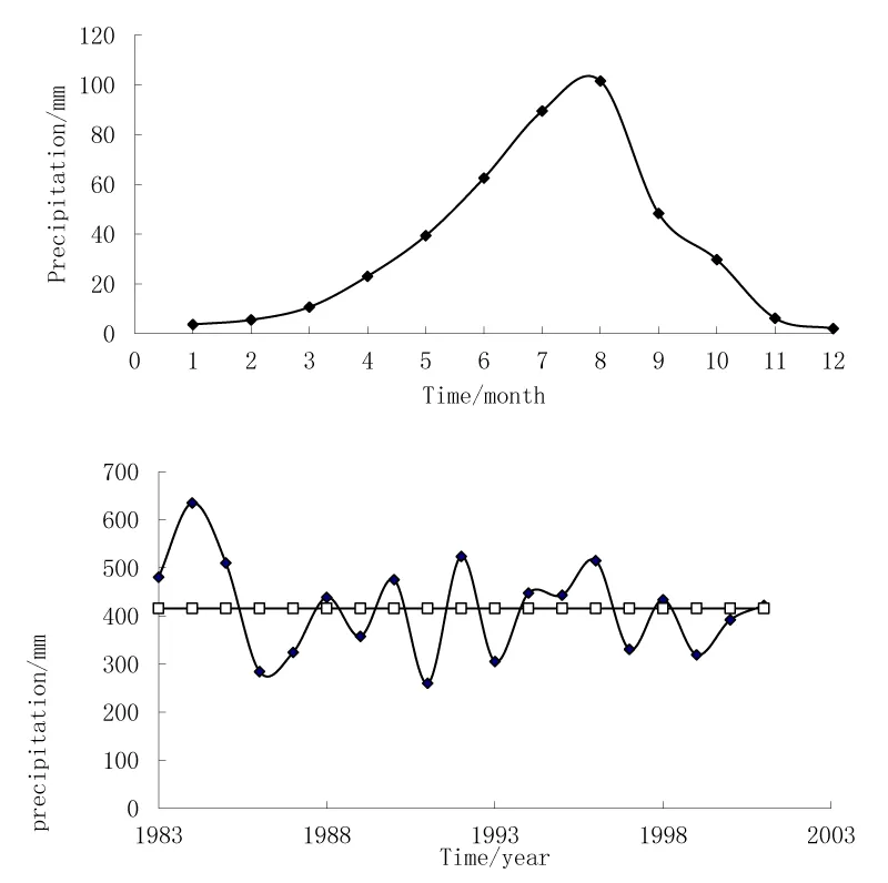 Study site: The study was conducted at the Shanghuang Eco-experimental Station (latitude 35°59´-36°03´N, longitude 106°26´-106°30´E) in the semi-arid region of the Loess Plateau, in Guyuan County, in the Ningxia Hui Autonomous Region of western China. The area is in a hilly loess region with an elevation range of 1,534 m to 1,824 m with slope gradients of 10°to 25°. The main soil type is Huangmian soil 7] which is developed from loess parent material and is susceptible to soil and water losses, which are serious in this region. The rainfall is unevenly distributed in the year with a mean annual precipitation of 416 mm, and rainfall from June to September accounts for 64.7% of the total annual precipitation. The coefficient of variation of precipitation among the years from 1983 to 2001 was 23.8% and rainfall amounts ranged from 260 to 635 mm. The mean level of solar radiation is 5,342 MJ m2; the annual average temperature is 7.0°C. The plant growing period is 152 days.