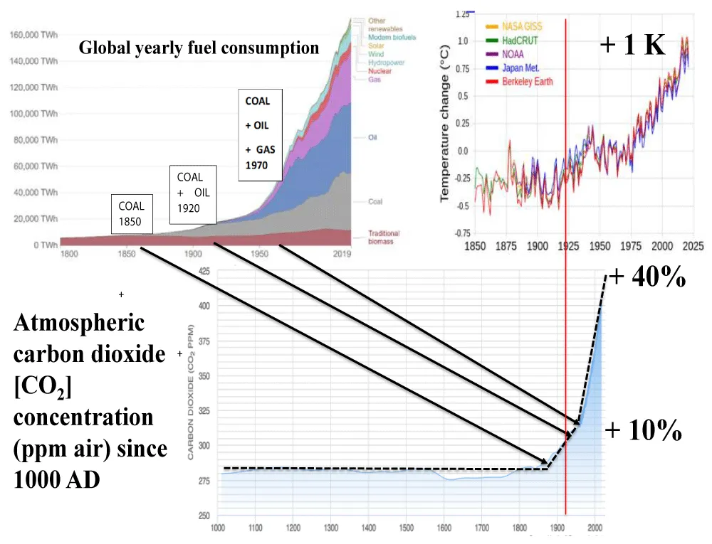 This ESD editorial statement by Kleidon et al. is merely a restatement of the IPCC greenhouse gas hypothesis. We quote [1]: “the greenhouse gas forcing can then explain very well the increase in mean global surface temperature of over 1 oC since preindustrial times.” In fact, the statement is misleading. Figure 1 shows that the [CO2] increase above 285 ppm began with the use of coal at the start of the Industrial Revolution around 1850, whereas the global warming index from 1850 to 1920 was zero, i.e., in disagreement with the GGH. The absence of climate-change events before 1950 may be explained by coal combustion, unlike hydrocarbon fuels, coal does not emit H2O into the atmosphere (Table 1).