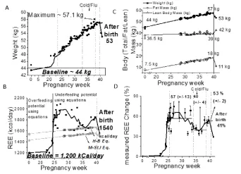 Overall, data from our 4 cases indicate that weight gain and REE changes are unique for each woman, and that there are likely complex factors that influence caloric needs during pregnancy. In fact, the unique patterns observed for changes in weight and REE suggest that REE estimates by equations are inaccurate, and the only way to assess the actual REE is to measure it.