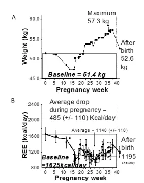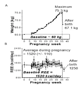 Personal weight tracking allowed the participants to have greater control overweight changes throughout the pregnancy, especially at the second and third trimesters when fetal growth is associated with greater maternal weight gain. In addition, the measurement of REE revealed unique metabolic profiles during the pregnancy among these participants, and further supported the inaccuracy and risks of using REE estimations from equations, as well as current clinical caloric consumption recommendations. In other words, it was concluded that careful tracking of REE is necessary to obtain accurate caloric intake goals during pregnancy.