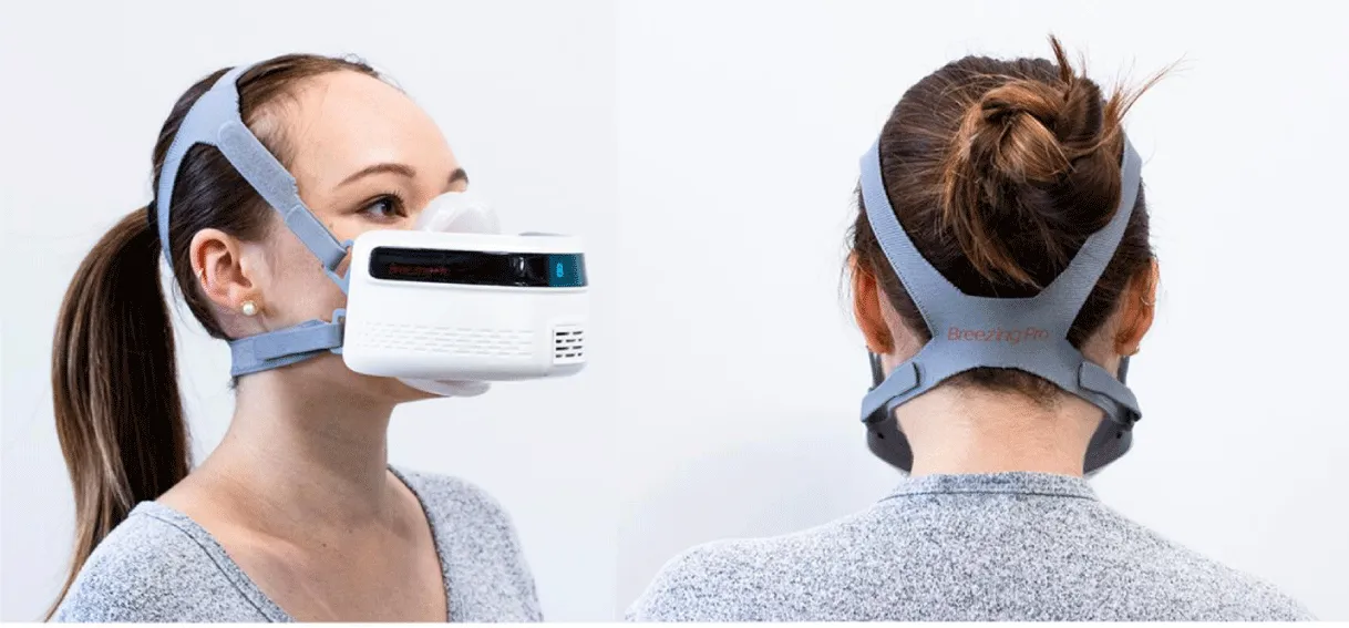 - An app with cloud-based data management (see more detail below).Similar to the previous Breezing® Tracker, the subjects inhale air from ambient and exhale into the device. The one-way valve systems (check-valve) on the mask separate the inhalation and exhalation processes. The data from the wearable device is also wirelessly transmitted to the customized app on the mobile device via Bluetooth. Headgear is provided to attach the indirect calorimeter device to the user making it a self-contained, easy to use, wearable metabolic analyzer.