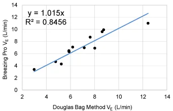 In addition to validation for oxygen and carbon dioxide, the VE parameter was also validated using a subset of the previously described subjects (N=13) and an independent set of tests. In this case, the VE values were measured as the time to complete 49 L (maximum capacity of Douglas bag) exhaled breath at ambient conditions. Ambient conditions were measured and applied in the correction of breath volumes for reporting final VE values under standard temperature, and pressure dry conditions (STPD). Data collected was analyzed and compared with VE obtained from Breezing ProTM device tests.