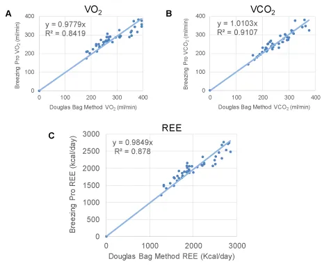 Conclusions: The accuracy of Breezing ProTM for measuring VE, VO2, VCO2 and REE has been validated using the gold standard Douglas Bag method. The results indicate that Breezing ProTM is reliable for resting metabolic parameters measurements.