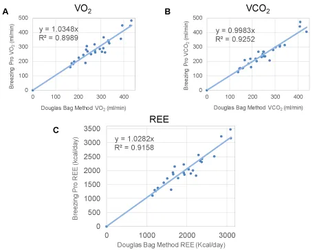 The values for measured REE ranged from 1143 to 3101 kcal/day. The linear fit comparing Breezing ProTM REE values and the corresponding Douglas bag values had a slope of 1.0282 and an R2 of 0.9158 (Figure 4C) and a ppaired t-test of 0.1615. The mean difference of the measured REE between the Breezing ProTM and Douglas bag method is 58 kcal/day, indicating no significant difference between the two methods.