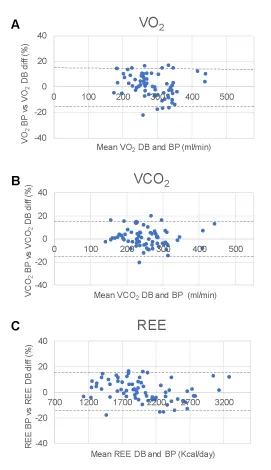 As can be seen in Figure 5, the Bland-Altman plots were analyzed for diagnosis of VO2, VCO2 and REE for all the tests including single and multiple batches. These graphs show agreement between Breezing ProTM and the Douglas Bag Method, with relative errors within ±15% for the metabolic parameters for 95% of all the values.