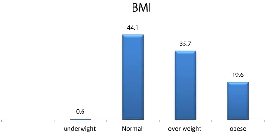 Additionally, nearly one fourth of participants (26.8%) had not attend diabetic education sessions while (12%) of them attended regularly. It was also observed that one fourth (25.5%) of diabetic patients were member of Ethiopian diabetic association. The mean BMI was 27 (SD±13) and 44.1 % of respondents had normal BMI while 19.6 % of respondents were obese. Likewise (17.3%) of patients had abdominal obesity (Table 2 & Figure 1).