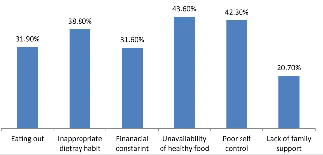 Among the respondents one hundred seventy one (43.9%) answered unavailability of healthy food while166 (42.3%) reported Poor self control and 152 (38.8 %) inappropriate dietary habits as a reason fornot following the recommended diet (Figure 3).