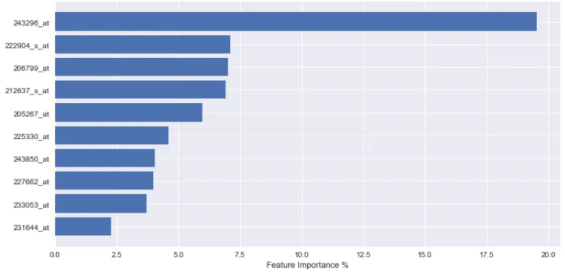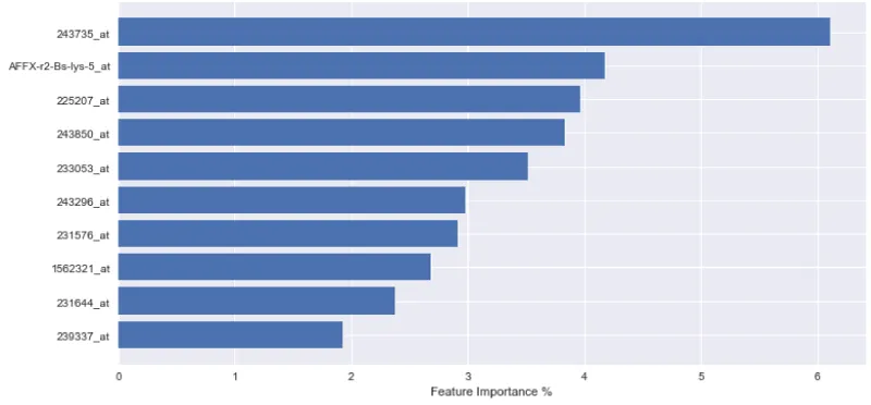 In order to express the weighting of data in the aforementioned decision-making process, the outputs of each variable importance for each tested model are visually displayed in Figures 1-3. The figures demonstrate the most significant 10 array IDs as determined via the use of each respective algorithm. Additionally, the respective contributions of these arrays to the model can be visualized in Table 2, where the array IDs are presented in terms of their corresponding gene name.
