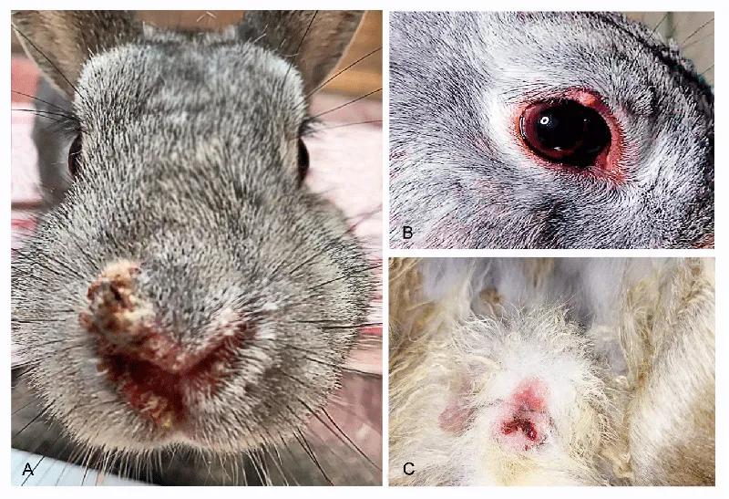 The disease is transmitted horizontally through direct or sexual contact. Transmission through extragenital and vertical contact during birth and lactation is also possible but rare [2]. Characteristic lesions in natural infections in rabbits include erythema, papules, ulcers and crusts in the perianal region, genitals, nose, mouth, and eyelids that are of high diagnostic value [9]; it has been associated with abortions, metritis and infertility [2,10,11]. Sneezing is the reported clinical sign associated with nasal lesions [11].