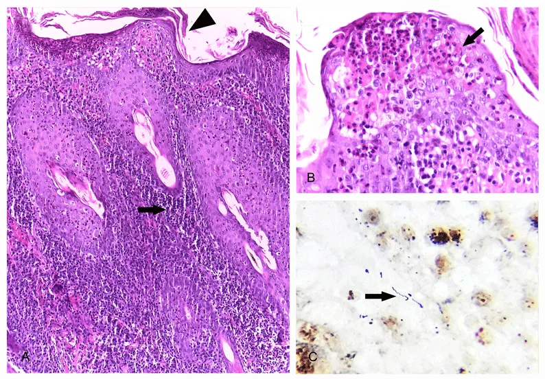 The histopathological analysis revealed heterophilic and lymphoplasmacytic dermatitis and folliculitis with acanthosis, hyperkeratosis, and subcorneal pustule formation (Figure 2A,B). These lesions were suggestive of Treponema spp. infection; therefore, a Warthin Starry stain was performed, showing few argyrophilic spirochetes in the epidermis and superficial dermis (Figure 2C).