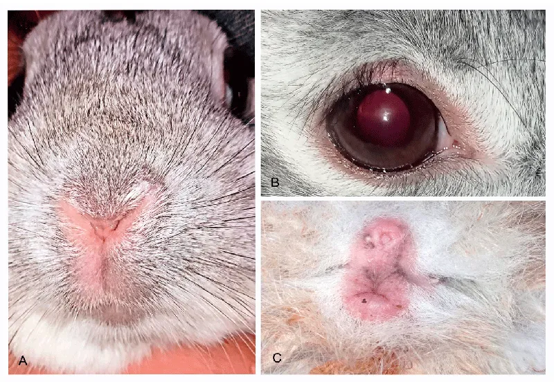 Domestic rabbit (Oryctolagus cuniculus), male, 6-year-old, located in Mexico City. Two months of evolution crust in the periphery of the right nostril was reported. On the mucocutaneous junction of the right nostril, a 2 cm long crust was observed. When it was removed, it had an ulcerative lesion with little serous secretion. A skin scraping was performed without microscopic evidence of ectoparasites. Topic treatment consisted of chlorhexidine, silver sulfadiazine, and imidacloprid. Two months later, the lesion spread to the periphery of both nostrils (Figure 1A). Cytology was performed, in which nonspecific heterophilic inflammatory alteration was observed. Oral enrofloxacin (5 mg/kg twice daily for 15 days) and meloxicam (0.3 mg/kg once daily for 5 days) were prescribed, with slight improvement. Fifteen days later, lesions were observed also in the perianal, genital, and upper right eyelid areas (Figure 1B,C). An incisional biopsy of the lesion in the nose was performed with a 6-mm punch and was sent for histopathological examination.