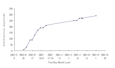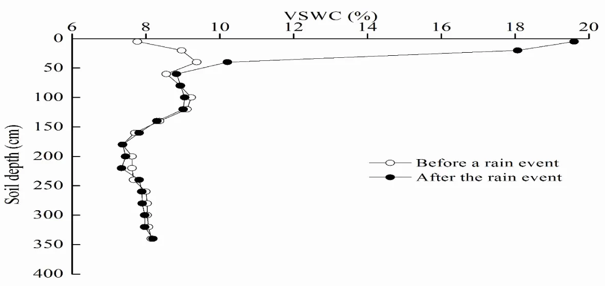Infiltration depth for one rain event can be determined by the two-curve method found in 2004 and named in 2016. The infiltration depth equals the distance from the surface to the crossover point between the two respective soil water distribution curves of soil water with soil depth before and after the rain event (figure 1). The MID will occur after a continuous heavy rainfall event and a long-term cumulative infiltration process, and can be determined by a series of two-curve methods (figure 2) [6,7].