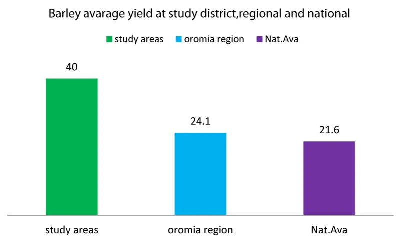Grain yield Comparison among the study district , Oromia regional state and Ethiopian national average barley yield were made. From the result it was observed that the study area has 54 % yield advantages than the Oromia regional barley average yield and a 66 % yield advantage than the Ethiopian national barley average yield as showed in Figure 1. The study areas scored an average yield of 40.0 q/ha for IBON 174/03 malt barley at Dodola district, 24.1 q/ha of Oromia regional average barley yield and 21.6 q/ha of Ethiopian national barley average yield.