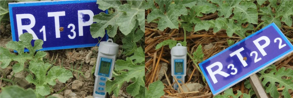 The result showed that different types of mulching material significantly influenced the growth parameters of watermelon viz- Plants per plot, Vine length, Number of fruits per plan and Individual fruit weight over control. Among different mulching treatments, treatment (P1) silver polythene mulch resulted higher Plants per plot (17.25), Vine length (265.42), Number of fruits per pit (1.77) and Individual fruit weight (5.54) (Table 6). The increase in growth parameters was attributed to sufficient soil moisture near root zone, increasing soil temperature, minimize soil salinity (Figure 3) and minimized the evaporation loss due to mulching. The extended retention of moisture and availability of moisture also leading to higher uptake of nutrient for proper growth and development of plants, resulted higher growth of plant as compared to control. It was found that all the treatment of mulching material was significantly increased the fruit yield of watermelon. A similar statement was reported by Khalil, et al. [18]. Among all mulching treatments, maximum fruit yield (27.98 t/ha) recorded in treatment (P1) silver mulch which was higher as compared to other mulch. The lowest yield (25.33 t/ha) were observed in without mulch condition.