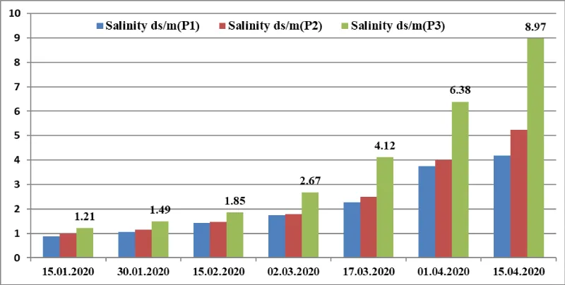 Production of high value crops in the coastal saline areas particularly during Rabi season (dry season) is very limited due to rise in soil salinity. The maximum amount of fertilizer dosage that can be increased while reducing the increase in soil salinity and promoting crop growth. From this study it was revealed that, fertilizer doses and mulching both minimizes rise in soil salinity significantly. Besides, use of cowdung and extra amount of potassium (K) with recommended fertilizers along with mulching helps to reduce soil salinity and increased crop yield.