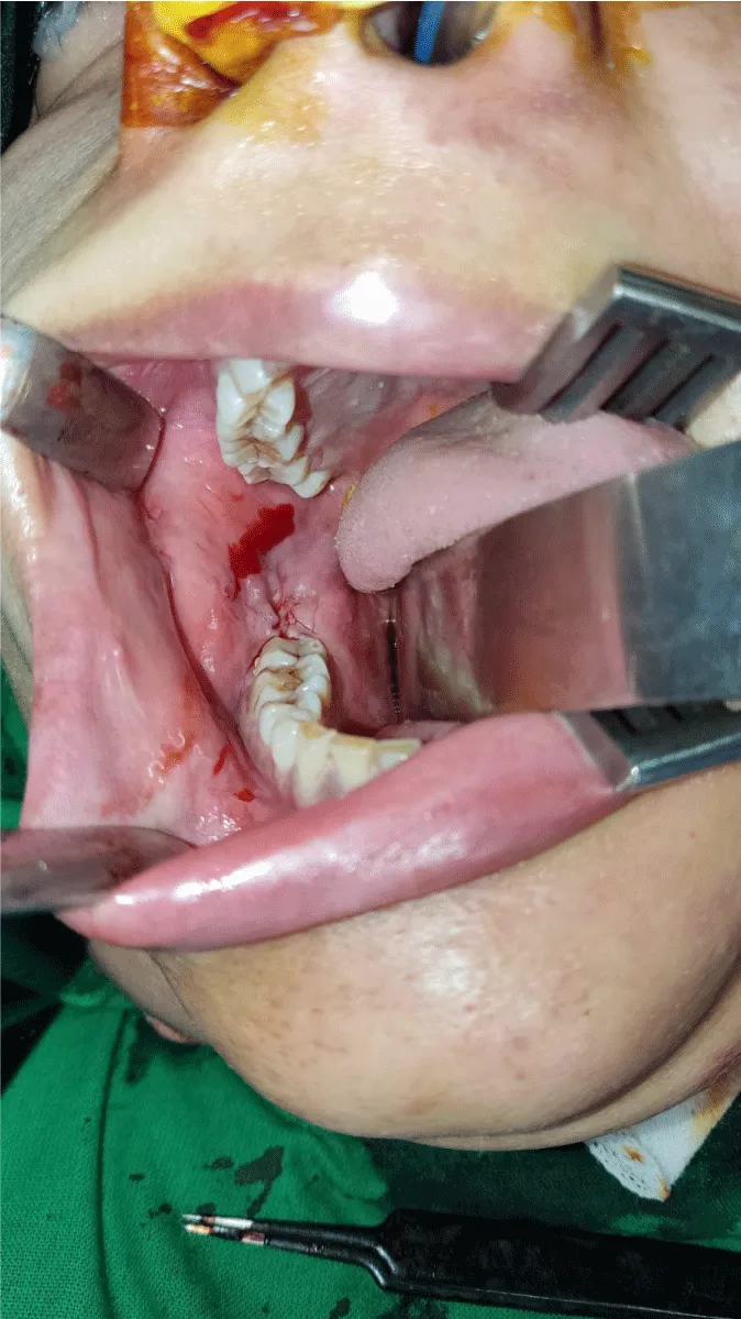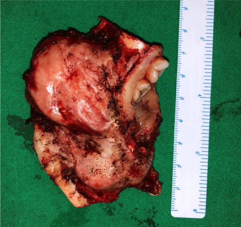After written and informed consent, baseline investigations, pre-operative workup, and general anesthesia fitness. She was booked for elective intra-oral surgery and shifted to Operation Theater. She underwent the complete surgical resection of the lesion with the extraction of involved teeth, enucleation, and curettage of the involved bone (Figure 8). The patient went through a smooth recovery with no drastic or minor complications on antibiotics and symptomatic treatment in the hospital postoperative course and on a follow-up visit. Post-operative radiological imaging showed no evidence of recurrent or residual lesions.