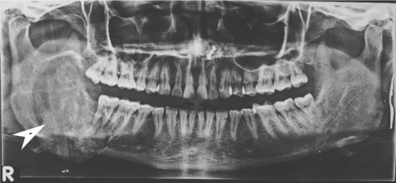 30 years old female presented in the outpatient department of oral and maxillofacial surgery with a complaint of painless swelling in the right lower jaw for 1 year. Initially swelling was small in size and non-palpable gradually increase in size and become clinically visible resulting in asymmetry of the face.