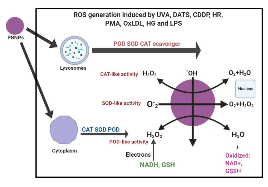 Superoxide Dismutase (SOD) enzyme is needed for antioxidants' defences, maintaining the level of O2- [4]. According to some new research, the Hollow PB nanozymes (HPBZs) contain multienzyme-like properties such as neuroprotection, and they scavenge the ROS( [19] (Figure 1). The over-production of ROS effect biomolecules leads to a wide range of human diseases, and induce tissue injury. Human skin which acts as a protective layer between the external environment and body is prone to pro-oxidant agents. ROS's over-production causes inflammatory and allergic skin disease, for example, psoriasis, urticaria, and atopic dermatitis [20].